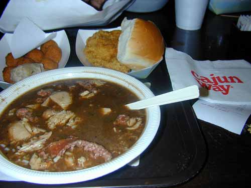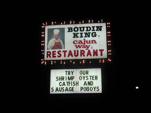 While driving toward Louisiana, John was looking through the book, "Eat Your Way Across America." He saw that there was a restaurant in Jennings, Louisiana. The heart of Cajun Country. We called them from the road to find out how late they were opened. 9:00 was the answer. It was 7:00. If we put our minds and stomachs to it, we would make it. And we did. Boudin King. This guy is the self-proclaimed boudin king of Acadiana. Sort of the Abe Froman of Cajun sausages. We ordered some gumbo, hush puppies, fried chicken and a catfish po-boy. And, oh, yeah, a half-pound of boudin. Eh, la. We ate too much again. We are not learning on this road. Just eating till we are too full. We are road dogs.