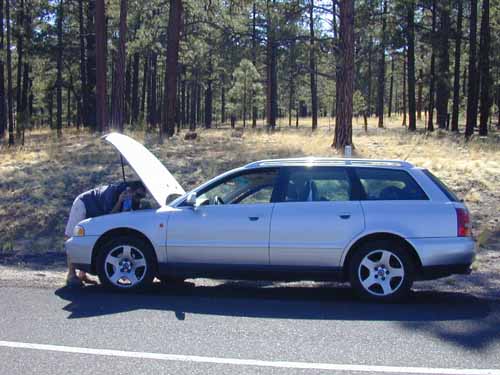 So there's something I forgot to mention yesterday. When John arrived in LA the other day, he said that his Cooling System Warning Light had come on and he had some problems with spewing coolant. No biggie, I thought, we'll cross that bridge when we get to it. Well we got to it. For some reason, the car purred through the lower desert of California. It didn't so much as whimper as we sped through Phoenix. The 7800 foot climb to Lakeside was uneventful (except for some elk sightings).