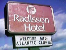 Sunday morning I met Max in the city to go to breakfast. We ended up going to Philly for cheese steak sandwiches (Cheez Whiz). Max was picking up his lovely sister Mimi from Paris. On the way into Philly, we came across a Radisson hotel with a disturbing sign out front. Apparently some sort of clown convention. Mid-Atlantic Clowns, no less. Probably the largest collection of axe-murderers and child molesters outside of Attica.